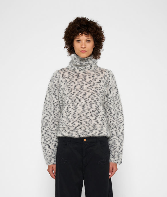 Een coltrui met pofmouwen en luipaardprint wie wil dat nu niet. De trui is lekker wijd het zit relaxed. Je kunt er heerlijk mee naar je werk. Ook is hij gemaakt van moahair ( gebreide wol). Lekker warm blijven deze winter met deze trui kun je zeker wel.