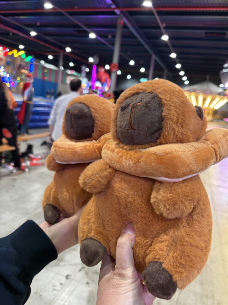 We hebben veel spelletjes gespeeld en zelfs een aantal knuffels gewonnen, waaronder deze capibara en twee andere knuffels.